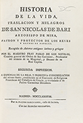 1788. — LIBRO : — (HAGIOGRAFÍA).— NICOLAS, PABLO DE SAN : — HISTORIA DE LA VIDA, TRASLACION Y MILAGROS DE SAN NICOLAS DE BARI ARZOBISPO DE MIRA, PATRON Y PROTECTOR DE LOS REYES Y REYNOS DE NAPOLES.— Madrid : D. Placido Barco Lopez, 1788....