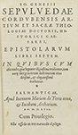 1557.— LIBRO : — (LITERATURA).— SEPULVEDAE CORDUBENSIS, IO. GENESII : — EPISTOLARUM LIBRI SEPTEM.— Salmanticae : Apud Ioannem Mariam da Terra nova, et Iacobum Archarium, 1557. 8º menor. 8 h. + 280 fol. + 7 h.