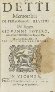 1610. — LIBRO : — (PAREMIOLOGÍA).— BOTERO, GIOVANNI : — DETTI MEMORABILI DI PERSONAGGI ILLUSTRI DEL SIGNOR...— Vicenza : Francesco Bolzetta, 1610. 8º menor. 8 h. + 174 fol.