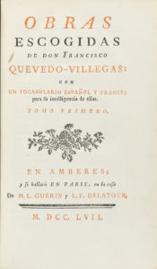 1757. — LIBRO : — (LITERATURA).— QUEVEDO-VILLEGAS, FRANCISCO DE : — OBRAS ESCOGIDAS DE...— Amberes : casa de H. L . Guerin y L. F. Delatour, 1757. 2 vol. 8º menor. I : 2 h. + XV + 358 p. + 1 h. II : 2 h. + 399 p. Portadas a dos tintas. Dos...