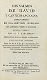 1789. — LIBRO : — (LITERATURA HEBREA).— LALLEMANT, P. : — LOS SALMOS DE DAVID Y CÁNTICOS SAGRADOS INTERPRETADOS EN UNA BREVÍSIMA PARÁFRASIS EN SENTIDO PROPIO Y LITERAL.— Madrid : Imp. de la viuda de Ibarra, 1796. 8º. Frontis...