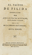 1792. — LIBRO : — (LITERATURA).— GALVEZ DE MONTALVO, LUIS : — EL PASTOR DE FILIDA.— Valencia : oficina Salvador Faulí, 1792. 8º. LXXXIV + 389 p. + 1 lám. con el retrato del autor grabado por Cucó.