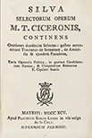 1795. — LIBRO : — (LITERATURA-CLÁSICOS).— CICERONIS, M. T. : — SILVA SELECTORUM OPERUM. Matriti : Apud Placidum Barco Lopez, 1795. 8º menor. 3 h. + 376 p. Enc. en pergamino de época, con injerto en una punta del plano anterior. Al verso de...