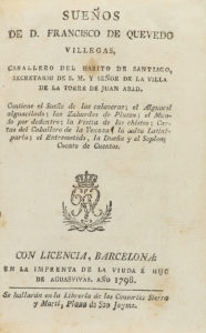1798. — LIBRO : — (LITERATURA).— QUEVEDO VILLEGAS, FRANCISCO DE : — SUEÑOS DE...— Barcelona : Imp. viuda e hijos de Aguasvivas, 1798. 8º menor. 1 h. + 362 p. Enc. en media piel, planos rozados. Palau 244053.