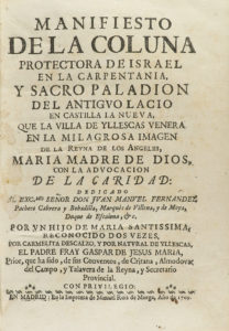 1709. — LIBRO : — (LOCAL-TOLEDO).— JESUS MARIA, GASPAR DE : — MANIFIESTO DE LA COLUNA (sic) PROTECTORA DE ISRAEL EN LA CARPENTANIA, Y SACRO PALADION DEL ANTIGUO LACIO EN CASTILLA LA NUEVA, QUE LA VILLA DE YLLESCAS VENERA EN LA MILAGROSA...
