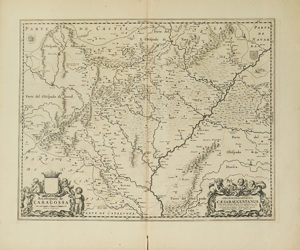 1640 ca. — MAPA : — (ARAGÓN).— BLAEU : — ARÇOBISPADO DE ÇARAGOSSA. ARCHIEPISCOPATUS CAESARAUGUSTANUS.— Mapa calcográfico sobre papel verjurado. Papel : 54 x 63,5 cm; huella : 42 x 53,5 cm. Texto al dorso en latín. Señal de doblez...