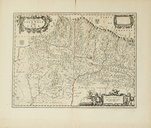 1665. — MAPA : — (JACA).— LABANNA, JOANNE BAPTISTA; BLAEU : — EPISCOPATUS IACANSIS Vulgo IACA.— Mapa calcográfico sobre papel verjurado. Papel : 54 x 63,5 cm; huella : 38,5 x 50 cm. Texto al dorso en latín. Señal de doblez central...
