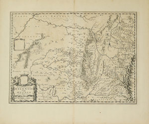 1665. — MAPA : — (ARAGÓN).— LABANNA, B. : — EPISCOPATUS OSCENSIS Vulgo HUESCA.— Mapa cacográfico sobre papel verjurado. Papel : 53,5 x 63 cm; huella : 38,5 x 53 cm. Texto en latín al dorso. Marca de doblez central con pequeñas...
