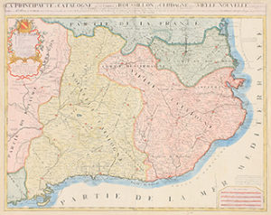 1694. — MAPA : — (CATALUNYA).— CANTEL, TILLEMONT et NOLIN, I. B. : — LA PRINCIPAUTE DE CATALOGNE AVEC LES COMTEZ DE ROUSSILLON ET DE CERDAGNE DIVISÉE EN VIEILLE ET NOUVELLE, ET EN VEGUERIES...— Paris : I. B. Nolin, 1694. 46,5 x 57,5 cm ha...