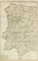 Límites iluminados a mano. Parte oeste de la Península Ibérica, mapa editado en el Atlas Nouveaux que describía en gran detalle las batallas que se libraron en Europa y América durante la Guerra de Sucesión española. Plegado.