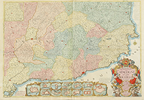 Límites y territorios coloreados, así como la cartela, grabada por C. Roussel y la parte inferior del mapa, que contiene 12 planos de las fortificaciones de Barcelona, Rosas, Tortosa, Palamós, Hostalric, Castellfollit, Girona, Tarragona, Colliure, Lleida, Mont-Louisy Perpignan.