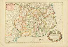 1706. — MAPA : — (CATALUNYA).— SANSON : — PRINCIPAUTÉ DE CATALOGNE OU SONT COMPRIS LES COMTÉS DE ROUSSILLON, ET DE CERDAGNE, DIVISÉS EN LEURS VIGUERIES.— Paris : Chez S. Iaillot, 1706. 47 x 66 cm huella, 54 x 76,5 cm papel.