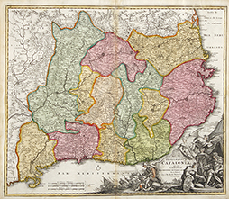 1735 ca.— MAPA : — (CATALUNYA).— HOMANN, JUAN BAUTISTA : .— PRINCIPATUS CATALONIAE NEC NON COMITATUM RUSCINONENSIS ET CERRETANIA.— Mapa grabado al cobre y coloreado de época de 49 x 57,5 cm. antigua señal de doblez central. En la esquina...