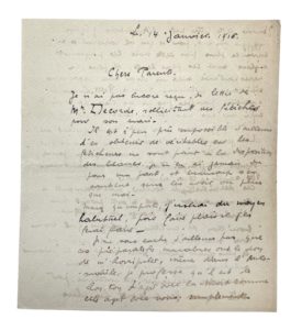 [Cameroun], 14 janvier [1917], avec mention « 1916 » erronée. 4 pp. in-4. RARE LETTRE DE JEUNESSE, ÉCRITE LORS DU SEJOUR EN AFRIQUE QUI LUI INSPIRA DES PAGES MEMORABLES DE VOYAGE AU BOUT DE LA NUIT.
