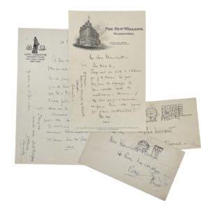 – New York, « ce 27 » [avril 1925, d'après le cachet postal]. « Et bien, ma grande ? Plus un mot ? Tu ne sais pas combien j'ai de bonne affection pour toi. Tu es une des rares filles qui aye compris sans me le dire mon immense lyrisme – peut-être la seule. Je voudrais te savoir heureuse, Blanchette. Je t'aime bien, tu sais. [Il donne alors son adresse chez le ministre canadien de la Santé publique.] Je rentre le 1er juin à Paris. »(1 p. in-8, en-tête imprimé du Hotel Lafayette à New York, enveloppe conservée).