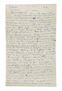 Klarskovgaard à Korsør au Danemark, « le 5 » [sans doute le 5 septembre 1950]. 1 p. 3/4 in-folio, avec mention « urgence » au crayon rouge.