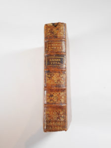 ALMANACH royal, année 1774 . Paris, Le Breton. In- 8 veau fauve marbré pièce de titre sur le dos à nerfs fleurdelisé et dor. triple fil. dor. encadrant les plats avec fleur de lys d'angle (Reliure de l'époque usagée) Ff. blancs intercalés...