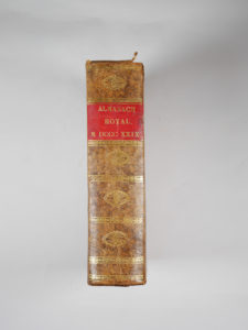 ALMANACH royal pour l' an 1829 présenté à Sa Majesté. Paris, Guyot et Scribe. In- 8 veau fauve raciné, pièce de titre sur le dos orné et dor. (Reliure de l'époque usagée) Coiffe et coins endommagés. Ex- libris ancien.