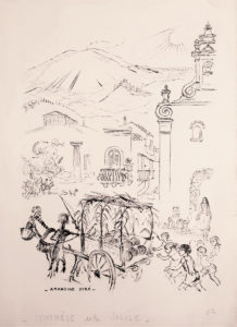 trinacria" 17 sur 27 cm page 25 "femme de Messine" 33 sur 26 cm page 32 'colporteur" 18 sur 12 cm découpes page 33 "poissonier à pédale" 13 sur 20 découpes page 34 "marchand de charbon et de lessive" 17 sur 30 cm page 42 "le corbillard de Termini" 31,5 sur 23,5 cm page 54 "quartier de la Sina à Palerme" 35,5 sur 26 cm page 58 " Kiosque à Palerme" 28,5 sur 22,5 cm page 65 "Nécropole du couvent des Capucins : le clergé" 21 sur 26,5 cm page 71 "procession d'enfants le 15 Août" 22,5 sur 28,5 page 85 "Palerme. Le théâtre des Pupi" 25 sur 31,5 cm page 96 "Première vision de Segeste" 19 sur 24 cm page 117 " route de Selinonte" 21 sur 27 cm page 120 "Agrigente. Quartier de Santa Maria dei Greci" 37,5 sur 27, 5 cm page 123 "les trois belles d'Agrigente" 19 sur 27 cm page 126 "tous les prêtres sont gras" 22 sur 14 cm page 133 "parure d'une mule à Agrigente" 24 sur 19 cm page 147 "Syracuse Lungomare Alphéo" 27 sur 38 cm page 156 "Syracuse. Ex voto de pêcheurs" 18,5 sur 26 cm page 160 "Le cratère de l'Etna" 24 sur 19 cm page 165 "Acireale le moine mandiant ventru" monogramme 24 sur 19 cm page 170 "notre amie de Mazzaro" monogramme 27 sur 21 cm page 172 "Forza d'Agro" 27 sur 18,5 cm page 184 " Enna" 37,5 sur 27 annoté en bas à droite page 198 "Piazza Armerina. Retour des champs" 37,5 sur 27 cm page 202 "Vers Palazzo lo" 32 sur 27 cm page 210 "Entre Enna et Caltamisetta" 28 sur 22,55 cm page 213 "La petite de San Spirito" 27 sur 21 cm page 220 "Le lac de Prizzi" 19 sur 27,5 cm page 221 "Corleone" 15,5 sur 8,5 cm page 223 "Piana degli Albanesi" 27 sur 18,5 cm page 237 "Isnello" 38 sur 27 cm page 246 "Synthèse des éoliennes" 37,5 sur 27 cm page 249 "Vulcano" 19 sur 30,5 cm page 254 "Lipari" 38 sur 27,5 cm page 258 "Musiciens ambulants" 28,5 sur 31,5 cm monogramme accidents page 274 "Stromboli, cuisine de notre maison" 27 sur 33 cm page 286 "Synthèse de la Sardaigne" 38 sur 27 cm annoté en bas à gauche page 291 "En Gallura" 19 sur 27 cm page 296 "Sur les routes de Gallura par la pluie" 19 sur 27 cm page 297 "femme d'Aggius" 19 sur 10 cm annoté page 303 "petits ânes et moutons blancs" 19 sur 27 cm page 307 "femme d'Ittiri" 19,5 sur 19 cm page 317 "femme de Nuoro" 19 sur 19 annoté page 318 "costumes masculins d'Oliena" 21,5 sur 19 cm annoté page 328 "femme de Cabras" 23 sur 19,5 cm annoté découpes page 329 "femme à la jarre, de Milis" 17,5 sur 24,5 annoté et monogrammé page 340 "costumes de Teulada" 22 sru 16 cm page 341 "Gisca l'accordéoniste de Pula" 26 sur 19,5 cm monogrammé page 345 " à Gairo" 20 sur 14cm annoté page 346 "à Lanusui" annoté et monogrammé 27 sur 27,5 cm page 347 "à Girasole" 18,5 sur 17,5 annoté page 349 "à Dorgali" 19 sur 17 cm annoté page 355 "D'Abbasanta" 27 sur 19 cm page 356 "Abbasanta" annoté 27 sur 16,5 cm