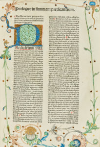 Summa predicantum. Tome I (sur 2). Reliure in-folio plein veau brun, reliure aux ARMES de Johannes Georg von Pichelstorff und Altenburg, dos à 4 nerfs, caisson à motifs floraux en cuir repoussé, pièce de titre sur cuir caramel, charnière frottées, restauration en tête et en queue de dos, trois tranches jaspées. Impr. [1484 ed. Johann Amerbach] Premier volume : des lettres A à L. Complet des 34 ff. des tables, vocalis et realis, pour les deux volumes. Impression en lettres gothiques, deux colonnes de 53 lignes. Rubriqué en rouge. Numérotation du texte en marge. Chaque lettrine annonçant un changement de lettre de l'alphabet est enluminée. ff. 35 : Lettrine du Prologue enluminé de bleu, vert et feuille d'or, décor floral partant de la lettrine et encadrant la page : rouge pâle, bleu, vert, noir, feuille d'or. ff. 36 : Lettrine orné de vert, de rouge pâle, de bleu et de feuille d'or, un manque de feuille d'or sur la partie inférieur de la lettre A. Pour ces deux lettrines, il y a décharge sur le verso de la page à l'endroit des feuilles d'or. Les 9 autres lettrines (B, C, D, E, F, G, H, I, L) sont par alternance rouge et bleu, ornée de motifs floraux mais parfois de visage ou de décor géométrique à l'encre brune, parfois également bleu pour les lettrines rouges, rouge pour les lettrines bleues. Une vingtaine de pages jaunies, éparses, trace de mouillures en tête d'une dizaine de pages, sans nuire au texte, intérieur frais dans l'ensemble. Des notes manuscrites en marge, en partie rognées par le relieur. Ex-libris de Pierre L.Van Derhaegen : un tampon humide en page de garde. Jean de Bromyard, dominicain qui devint Chancelier de l'université de Cambridge en 1383, était auteur de manuels pour prédicateur. Ce catalogue alphabétique reprend les sujets importants ou à connaître pour un prêtre préparant ses sermons.