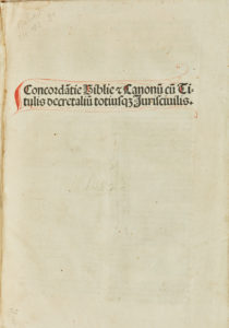 Concordatie Biblie et Canonum cum Titulis decretalium totiusque Jurisciuilis. In-folio plein vélin crème, dos lisse et muet, gardes de réemploi. Impr. Bâle Nicolaus Kessler 4 Juillet 1487. Impression en langue latine, caractères gothiques sur deux colonnes de 51 lignes. Exemplaire rubriqué en rouge et bleu. Quelques feuillets courts en tête, certaines coupes nuisant au titrage, tampon mouillé non identifié sur deux pages, en marge, intérieur frais et complet. Concordance de la Bible écrite par l'abbé de Joncels.