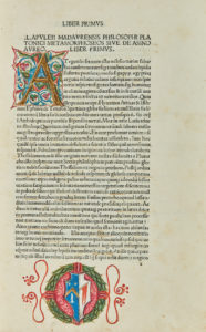 Opera. In-folio plein maroquin marron, bords biseautés et liserés d'encadrement à froid, dos à 5 doubles-nerfs encadrés de liserés à froid se prolongeant sur les plats, lettrines gothiques or désignant l'auteur, le lieu, la date, trois tranches dorées, contre-plats à la roulette, reliure signée David. Impr. Vicence, Henrico de Sancto Urso, 9 août 1488. Impression en lettres romaines, une colonne de 38 lignes. Une rubrique bleue. 20 lettrines enluminées, chacune annonçant le début d'un livre ou d'un chapitre : hauteur de 8, 7 ou 5 lignes, rose, or, bleu, vert. La première d'entre elle est accompagnée d'une conjonction de deux armoiries entourées d'une couronne végétale, les initiales F et C de part et d'autre. Le premier blason : d'azur au chevron d'or accompagné chef de deux étoiles du même et en pointe d'un tronc d'arbre d'argent. La deuxième est d'argent, au gonfalon de gueule, celui-ci possiblement la famille Confalonieri. Chacune des deux enluminures : rose, rouge, or, bleu, vert et feuille d'or. Notes manuscrites à l'encre brune en marge, certaines coupées par le relieur. Première page manuscrite et doublée. Ex-libris du marchand de diamants Albert Ehrman et un ex-dono daté du 17 mars 1949 de la bibliothèque Broxbourne, fondée par le même et sa femme. Quelques taches et traces de doigt, sinon intérieur frais dans l'ensemble Rare édition, introduite par la lettre Alerensis au Pape Paul II, suivit de la table, De Asino Aureo (L'âne d'or, autre nom de ses célèbres Métamorphoses), Floridorum (Florilège), Apologia, De Deo Socratis, De dogmate Platonis (De Platon et de son enseignement), De Philosophia, De Mundo, l'Asclepius attribué à Hermès Trismegiste, dont la traduction a été faussement imputée à Apulée et enfin Epitoma Alcinoi dans la traduction latine de l'humaniste Pietro Balbi, précédée de la lettre adressée par ce dernier à Nicolas de Cues.