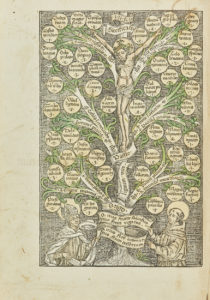 Egregium opus subtilitate et devoto exercicio precellens parvoru[m] opusculoru[m]. doctoris seraphici sancti Bonaventure. Deux volumes in-folio plein veau marron, encadrement à froid sur les plats, dos à 4 nerfs, pièce de titre sur cuir vert mais dos muet, deux fermoirs sur chaque volume. Impr. Strasbourg [Jordanus de Quedlinburg (Georg Husner)] 1495 et 18 décembre 1495 Quatrième édition. Impression en langue latine, caractères gothiques, deux colonnes de 52 lignes. Rubriqué en rouge, et chaque première lettrine de volume en rouge et bleu. Page de faux-titre du second volume avec inscriptions manuscrites et un tampon humide effacé. Quatre gravures sur bois pleine page dont trois représentant l'arbre de la sanguinité, celle en frontispice du second volume partiellement illustrée en vert (branchage de l'arbre), la dernière représente l'ordre des anges, séraphins etc. Rare notes ou petits dessins en marge Quelques traces de mouillures en marge, taches ou petits manques en marge occasionnels sinon intérieur frais. Célèbre édition des opuscules de Saint Bonaventure