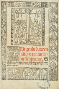 La legende doree en francoys nouvellement imprimée. Petit in-folio plein vélin crème, dos lisse, pièce de titre sur cuir bordeaux, lettrines or. Impr. Lyon Jehan de la Place 7 novembre 1518, Ed. Etienne Gueynard alias Pinet. RARE impression lyonnaise en françois (nous n'avons pas trouvé d'exemplaire équivalent) et en caractères gothiques, en deux colonnes de 46 lignes. Nombreuses lettres historiées, 18 pages avec frises d'encadrement et 10 gravures sur bois représentant des scènes bibliques. Quelques feuillets jaunis sinon intérieur frais. Tampons mouillés du grand séminaire de Grenoble. Deux notes manuscrites sur la page de garde «Souvenir de Mgr Pierre Chatrouse, évêque de Valence mort le samedi 16 mai 1854, donné par sa sœur Mme Henriette », la deuxième un commentaire sur ce grand classique : «Livre plus curieux qu'utile ; plus singulier qu'édifiant ; écrit avec plus de simplicité que de jugement ; plus de naïveté que de réserve. Etymologies forcées ; récits peu châssés (sic) et présentant des images dangereuses, histoires apocryphes, etc. »
