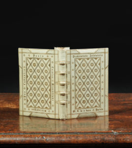 Probleumata. In-12 pleine peau de truie blanche, plats aux bordures biseautées, orné d'un encadrement de filets et fleurons or, titrage en lettrine gothique or, «Probleumata Aristotelis / M. N. de la barre / Parisis » sur le premier plat, «Pro Ludovico / Paris / Carolus Desamblanx / Bibliotheca », dos muet à 5 nerfs sertis de filets or se prolongeant sur les plats, contre-plats à encadrement, reliure signée Charles de Samblanx. Impr. Paris, Nicolas de La Barre s.d. (circa 1520) Impression en lettrines gothiques, une colonne de 32 colonnes, notes en marges, une lettrine. Bois-gravé de l'imprimeur en page de titre. Ex-libris de Ludovic Paris (médiéviste et bibliothécaire à Reims). Intérieur frais.