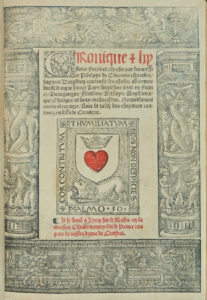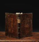 Cronique et hystoire faicte et composée par feu messire Philippe de Commines Chevalier, seigneur Dargenton, contenant les choses advenues durant le regne du roy Loys XI. tant en France, Bourgongne, Flandres Arthois Angleterre, que Espaigne et lieux circonvoisins. Petit in-folio plein veau brun, plat à encadrements en cuir finement repoussé, dos à 4 nerfs, pièce de titre beige collée sur le deuxième caisson, «Chronique de Philippe de Comines » manuscrite à l'encre noire. Impr. Lyon, Claude Noury, dit Le Prince, 12 avril 1526. Impression en françois et en caractères gothiques. Lettrines. Page de titre imprimée en noir et rouge, orné d'un encadrement de 4 gravures sur bois ainsi qu'au centre : enseigne de l'imprimeur à la marque cœur rouge surmonté d'une couronne encadré de sa devise. Une gravure pleine page la précède, représentant Louis XI sur son trône entouré de ses conseillers. Au verso de la dernière page, une phrase manuscrite «Sit nomen domini benedictum ». Quelques trous de vers en marge sinon intérieur frais. RARE. Cinquième édition gothique et première édition lyonnaise de cette première partie des Chroniques du règne de Louis XI, parue deux ans auparavant à Paris. Dernière édition séparée de cette chronique, qui sera par la suite réunie avec celle du règne de Charles VIII publiée en 1528. Rare et bel exemplaire de ces chroniques, majeures, tant du point de vue du langage que de celui de l'histoire de la transition entre Moyen-Âge et Renaissance.