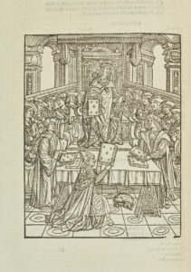 Illustrations de la Gaulle Belgique, antiquitez du pays de Haynau, et de la grad cite de Belges : a present dicte Bavay, dont procedent les chaussees de Brunehault. Et de plusieurs princes... jusques au Duc Philippes de Bourgongne, dernier decede. Trois volumes reliés en un. In-folio plein maroquin vieux rouge, liserés d'encadrement à froid, au centre de chacun des plats un fer or avec l'initiale V orné d'une composition végétale, quelques traces de frottement, contre-plats à la roulette, dos à 6 nerfs, lettrines or, trois tranches dorées, reliure signée Dewatines. Impr. Paris Galliot Du Pré 1531-1532 libraire-éditeur François Regnault. Edition princeps de cette chronique du Hainaut par Jacques de Guyse. Complet des trois volumes. Les pages de titre des deux premiers volumes dans un encadrement à colonnes gravé sur bois en noir et rouge, noir uniquement pour celle du troisième volume. Impression en lettres gothiques, deux colonnes de 52 lignes, lettrines, bois-gravés de l'éditeur et de l'imprimeur. 4 bois-gravés dont 3 pleine page en frontispice des premier et troisième volumes, le premier répété une fois de part et d'autre de la table, et un in-texte à la fin du prologue du Tome III. Rares taches au troisième volume sinon intérieur très frais. Ecrite en latin et dédiée au comte Albert Ier de Hainaut, la volumineuse histoire du Hainaut de Jacques de Guyse vient combler un manque : d'autres régions ayant leurs histoires mais pas le Hainaut, Jacques de Guyse s'y attelle. Premier abrégé de la traduction en françois, qui contrairement à ce qui est annoncé dans le premier volume et le titre ne va que jusqu'en 1258, alors que le règne de Philippe Le Bon annoncé commence en 1419.