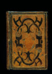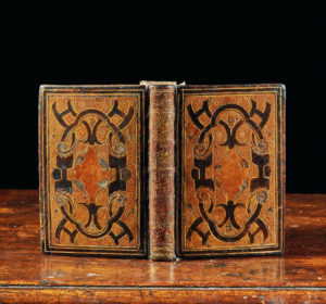 Coniuratio Catilinae et Bellum Iuguthinum. RELIURE A LA CIRE in-12 : plats ornés d'entrelacs de cire ocre, gros, fauve sertis de filets à chaud sur fond criblés, dos lisse et orné mais dorure passée, trois tranches dorées, restaurations en coiffe et charnières. Ensemble sous emboitage moderne de plein maroquin noir, premier plat avec une fenêtre en plexiglas, dos lisse, lettrine or et date en pied, signé Patrice Goy et Carine Vilaine. Impr. Lyon Antoine Gryphe 1570. Impression en caractères romains, une colonne de 32 lignes. Lettrines et notes en marges. Quelques taches et traces de mouillure. Signature de l'imprimeur sur le dernier feuillet laissant supposer qu'il s'agit de son exemplaire, une telle reliure étant surprenant pour un ouvrage de texte classique.
