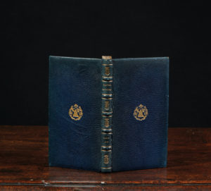 Mithridate. Reliure petit in-12 plein maroquin bleu nuit à longs grains, dos à 5 nerfs et fleurons, filets or sur les coupes et en contre plats, trois tranches dorées. Chez Claude Barbin Paris 1673. Edition Originale. 81 pages. Achevé d'imprimer le 16 mars 1673. Privilège le 2 mars 1673. Ex-libris de Ruperti de RIDOLPHIS et armes sur les plats. Tache au dernier feuillet. Certains vers n'apparaissent que sur cette E.O, ils seront retirés dès les éditions suivantes.