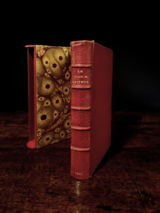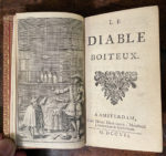 Le diable boiteux. In-16 plein maroquin rouge, dos à 5 nerfs, titre or et date en pied, trois tranches dorées, contre-plats à la roulette, étui. Amsterdam, chez Henri Desbordes, 1707. Rare édition parue la même année que l'original à Amsterdam. Complet de la gravure en frontispice représentant l'apparition du diable. Ex-libris de Maurice Cohen contrecollé. Un classique du roman de meurs en langue française. Paru en 1707 le texte fut remanié en 1726, or Lesage y opéra de si importants changements que les éditions antérieures à cette date sont à considérer comme un ouvrage distinct des éditions parues à partir de 1726, ce qui explique également leur rareté.