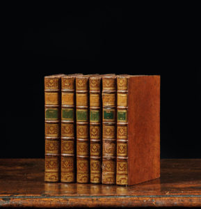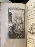 Œuvres philosophiques. Six volumes in-8, reliure plein veau fauve moucheté, dos à 5 nerfs richement ornés, titre sur maroquin havane et tomaisons sur maroquin vert Empire, tranches jaspées rouge, petit accroc au dos du tome V. Chez Rey Amsterdam 1772. Première édition collective des œuvres de Diderot. Bien complet du frontispice, et des planches (1 tome I, 8 tome II, 6 tome V et 7 tome VI). Ensemble homogène, et infimes mouillures. Ex-libris de l'homme politique François TEITGEN. Les principaux textes de Diderot et deux titres attribués faussement à Diderot mais de Morellet et Morelly.