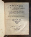Voyage à la Martinique (diverses observations sur la physique, l'histoire naturelle, l'agriculture, les mœurs et les usages de cette Isle). Reliure in-8 plein veau marbré, dos à 5 nerfs richement orné, pièce de titre au dos sur maroquin rouge, trois tranches rouges. Charnières frottées et décharges sur les pages de garde. J.B Bauche Libraire-Editeur Paris 1763. Edition originale. 192 pages et 76 pages d'observations et tableaux météorologiques. Complet de la carte dépliante. Ex-libris de Waldemar Schwalbe, daté 1937. Important ouvrage, fruit de 5 années d'observations sur place, sur les Caraïbes, leurs races, leurs mœurs, la flore et l'esclavage.