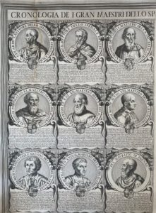 Les huit premières forment un grand tableau gravé (environ 160 x 115 cm monté), comprenant 72 portraits gravés avec de courtes notices biographiques, de Frère Gérard en 1099 à Emmanuel de Rohan-Polduc en 1797. Quant aux deux dernières feuilles, elles comprennent neuf portraits, jusqu'à G. B. Ceschi a Santa Croce, et neuf médaillons vides.