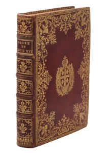 Paris, Vente et Patas, 1775. 2 parties en un volume in-4, maroquin rouge, large dentelle de rinceaux et fers rocaille avec fleur de lis aux angles, armoiries au centre, dos orné de fleurs de lis, dentelle intérieure, doublure et gardes de soie bleue, tranches dorées (Reliure de l'époque).Édition originale de ce très beau livre de fêtes publié sous la direction de l’abbé Pichon.