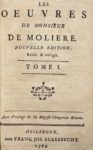 Volume inséré dans la reliure : MOLIÈRE. Les Œuvres. Nouvelle édition, revûë et corrigée. Heilbronn, Eckebrecht, 1763. 2 tomes (sur 6) en un volume in-8 (dimensions : 165 x 110 x 35 mm), gardes en papier d'Augsbourg, tranches rouges. Portrait de Molière gravé en frontispice.