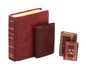 Paris, Marcilly fils, [1826]. Minuscule (26 x 18 mm), maroquin rouge, filets et roulettes dorés en encadrement, fleuron central, dos lisse orné d'une roulette dorée, tranches dorées, étui en maroquin rouge décoré, dos orné, trois côtés en papier doré (Reliure et étui de l'époque).Almanach lilliputien entièrement gravé, contenant huit chansons ornées d'autant de figures à pleine page et un calendrier.