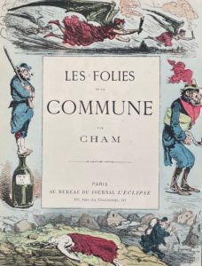 Paris, au bureau de L'Éclipse, s.d. [vers 1871]. 20 planches in-4 (330 x 245 mm), en feuilles. Suite complète d’un titre et 19 planches lithographiées par Cham en épreuves coloriées. Ces planches humoristiques sont « farouchement anti-communardes » (Le Quillec, n°899).