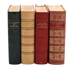 Paris, Plon-Nourrit & Cie, s.d. [1897-1904]. 4 volumes in-12, demi-maroquin avec coins bleu, blanc et rouge pour les trois premiers volumes, et rouge au dos finement orné pour le quatrième, tête dorée, non rogné, couverture (Durvand, Pagnant et Stroobants).Éditions originales des quatre parties de cette vaste fresque romanesque sur la guerre franco-prussienne et la Commune.