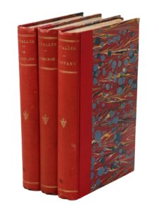Ibid., 1886. 3 volumes in-12, bradel demi-toile rouge, couverture (Reliure de l'époque).Trilogie complète, contenant L’Enfant et Le Bachelier en troisième édition et L’Insurgé en édition originale, publiée par Séverine après la mort de Vallès, avec son portrait par Ernest Clair-Guyot.