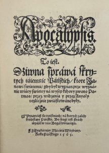 APOCALYPSIS — To iest, Dziwna spráwá skrytych táiemnic Páńskich, ktore Janowi swietemu przez widzenia y przez anyoły rozlicźnie zwiástowáne byly. S.l. [Cracovie], Maciej Wirzbięta, 1565 [i.e. Paris, Barousse, 1876].