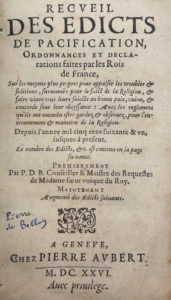 [BELLOY (Pierre de)] — Recueil des edicts de pacification, ordonnances & declarations faites par les rois de France, sur les moyens plus propres pour appaiser les troubles et seditions, survenues pour le fait de la religion.