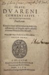 Cologne, Johann Birckmann & Werner Richwin, 1564. In-8, vélin souple (Reliure de l'époque).Ce traité de jurisprudence féodale est l'œuvre de François Douaren (1509-1559), professeur de droit français à Paris puis à Bourges.
