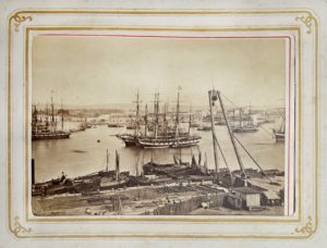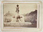 Bordeaux, Gustave Pujibet, s.d. [vers 1870]. Petit in-4, chagrin prune décoré d'une frise et de filets à froid et dorés, tranches dorées, fermoirs métalliques (Reliure de l'époque).Série de 21 vues des monuments et rues de Bordeaux (98 x 154 mm) en tirages albuminés, montés sur cartons et réunis dans un album. Étiquette de la papeterie Pujibet et légende manuscrite au verso des cartons.