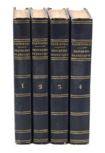 Paris, Delongchamps, 1822. 4 volumes in-8, bradel cartonnage bleu nuit, dos lisse fileté, non rogné (Reliure de l'époque).Édition collective très complète publiée par Charles de Méry avec une Vie de Carmontelle et une Dissertation historique et morale sur les proverbes.