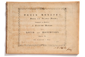 BEETHOVEN Ludwig van (1770-1827)Trois Sonates pour le Piano-Forte Composées & Dediées à Joseph Haydn... Œuvre II (Bonn, N. Simrock, [1798]) ; in-4 oblong (23,2 x 32 cm) de 51 pages, sorti d'une reliure (marque de pli au 1er feuillet, petite réparation marginale au dernier f.). Première édition allemande (la première avait été publiée en 1796 par Artaria) [Hoboken 18 ; Kinsky, p. 8]. Édition gravée, chaque planche portant le n° de cotage 75. Pagination manuscrite (71-121) recouvrant la pagination imprimée ; quelques doigtés notés au crayon.