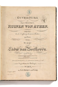 de cinq Ouvertures en partition d'orchestre. Musique gravée. Cachets encre sur les pages de titre A. Le Lièvre et Musis Sacrum 1828. Ouverture zu Aug: v: Kotzebue's Ruinen von Athen, Op. 113 (Wien, S.A. Steiner und Comp., [1823]) ; 26 pages, cotage S: u. C: 3951, [Hoboken 469]. Grosse Ouverture in C. dur [ut], Op. 115 [«Jour de fête»] (Wien, S.A. Steiner & Comp., [1825]) ; 43 pages, cotage S: u. C: 4682, [Hoboken 475]. Grosse Ouverture (in Es) zu König Stephan, Op. 117, 2e éd. (Wien, Tobias Haslinger, [1828]), 48 pages, cotage S: u. C: 4691, [Hoboken 479]. Ouverture en Ut à grand orchestre, Op. 124 [«Die Weihe des Hauses»] (Mayence, B. Schott Fils, [1825]), 60 pages, cotage 2262 (manque la liste des souscripteurs) [Hoboken 498]. Ouverture in C. componiert im Jahre 1805 zur Oper Leonore, Op. 138 [Leonore I] (Wien, Tobias Haslinger, [1838]), titre gravé décoré, 48 pages, cotage T.H. 5141 [Hoboken 537].